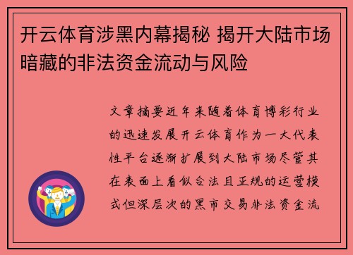 近年来,随着体育博彩行业的迅速发展,开云体育作为一大代表性平台,逐渐扩展到大陆市场。尽管其在表面上看似合法且正规的运营模式,但深层次的黑市交易、非法资金流动以及监管漏洞的存在,使得这一行业充满了不为人知的风险与危机。本文将深入探讨开云体育涉黑内幕,并揭示大陆市场中隐藏的非法资金流动与相关风险,力求为公众提供一个清晰的认知框架。文章将从四个主要方面进行阐述,分别是:平台背后的非法资金来源、开云体育如何在大陆市场规避监管、平台存在的安全隐患与用户风险,以及该行业给大陆社会带来的潜在危害。在分析过程中,我们将结合实际案例,全面揭示开云体育的内幕,并提出行业整顿的紧迫性与可行性建议。